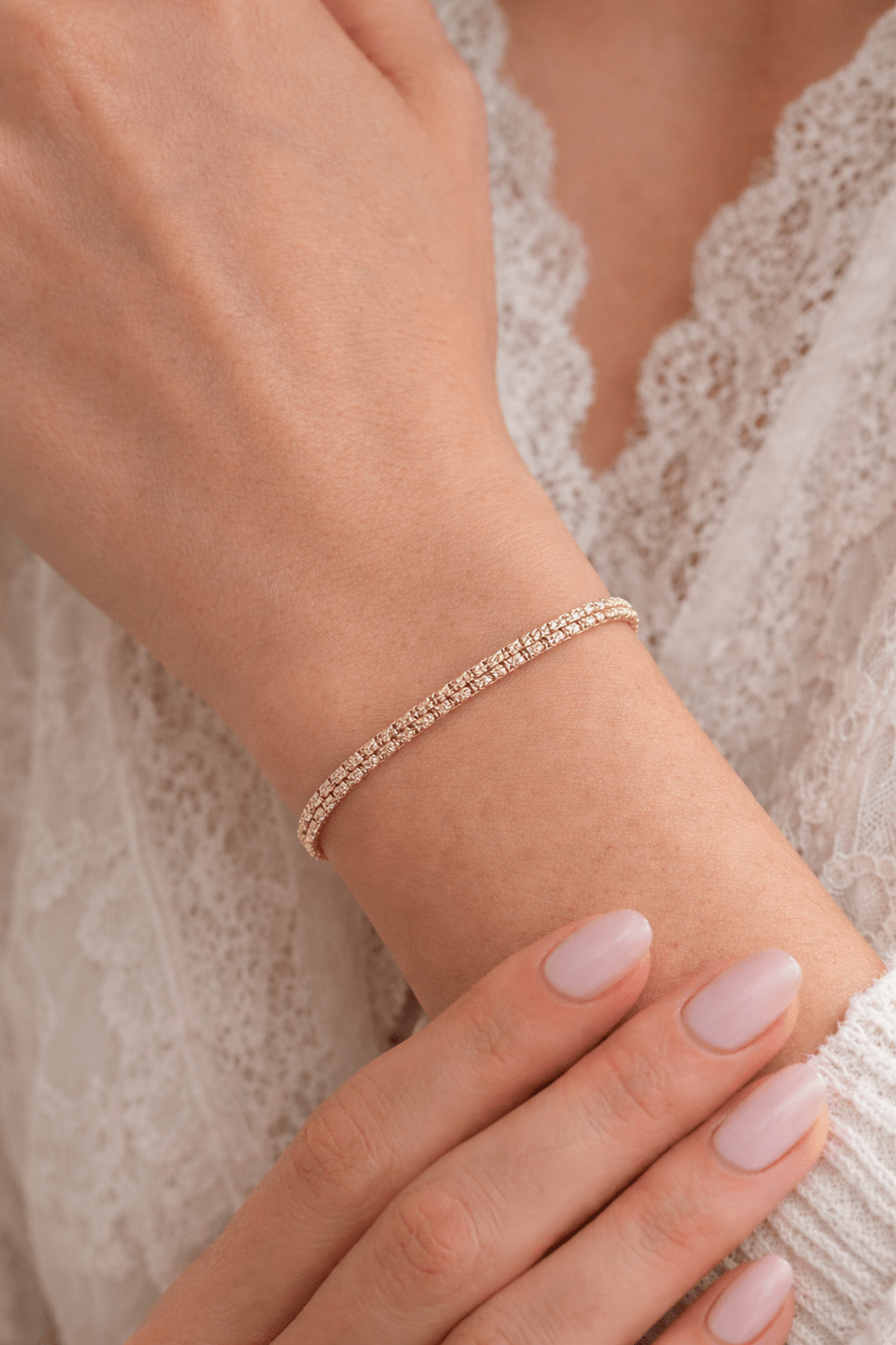 Élégant et intemporel, le bracelet Solange apporte une touche lumineuse à votre poignet. Sa maille souple et texturée reflète la lumière avec délicatesse, offrant un bijou raffiné à porter au quotidien comme pour les grandes occasions.